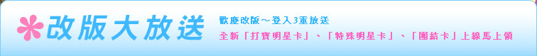 - 「打寶明星卡」、「特殊明星卡」、「團結卡」為消耗性道具,道具使用說明,請至官網改版報導頁查看。
