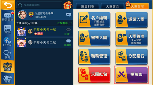 3.副團長能夠審核團員、剔除團員以及指定團幹部,且同時擁有編輯名片、開啟揪牌咖且設定揪牌咖鑽石底台之權力