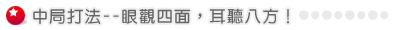 中局,是打麻將最重要的一個階段,也往往是一副牌成敗的關鍵。在這個時候,您應該已有初步的概念,知道自己該作什麼牌了,所以,就放心的將廢牌全打掉,並營造自己聽牌的機會吧!
