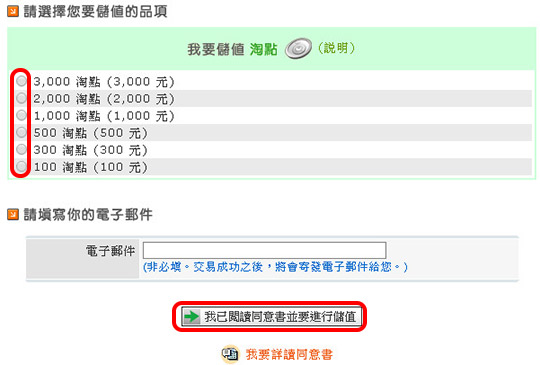 Step 2 請選擇您要儲值的品項,並閱讀使用同意書後,按下【我已閱讀同意書並要進行儲值】。