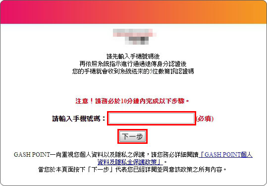 Step 3 進入GASH POINT小額付費服務頁面,輸入您的手機門號,按下【同意】鈕。
