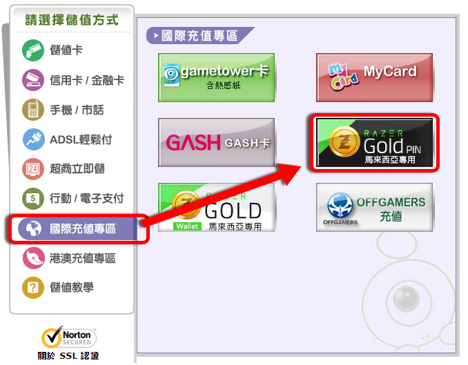 Step 1 在「儲值淘點」的頁面,選擇「國際充值專區→MOL」。