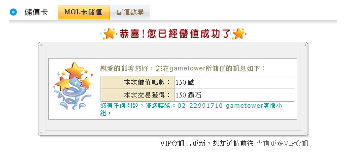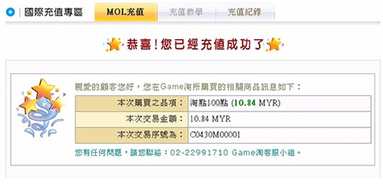 進入MOL付款介面 恭喜您充值成功