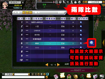 可以看到目前兩隊比數、個人排名、前50名排行榜…等資訊,在點選放大鏡圖示,還可查看該玩家資訊及進行互動喔!