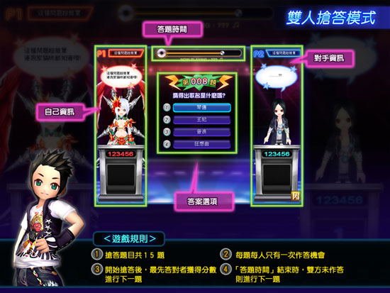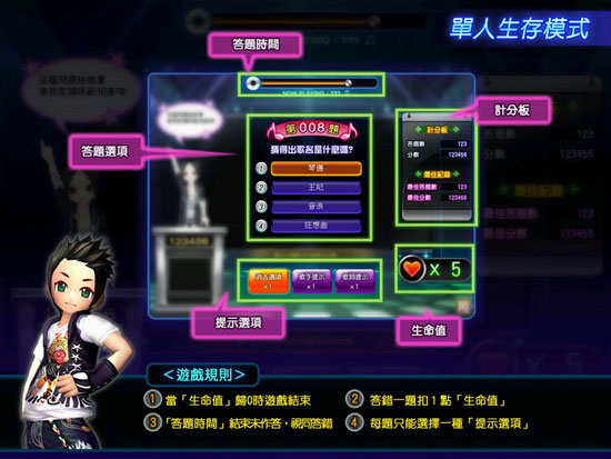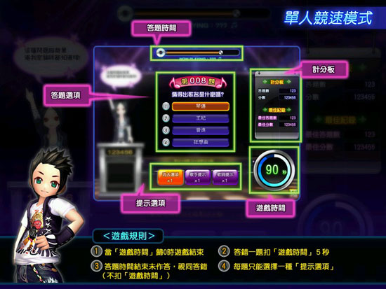 金曲智多星 猜歌名遊戲,答案為四選一方式,玩家用滑鼠點選正確答案作答。 適合1~多人遊玩;賽程分成生存模式(單人)、競速模式(單人)、搶答模式(雙人or多人)。 A.生存模式:採生命制,當生命歸0時遊戲結束。 B.競速模式:採時間制,當時間歸0時遊戲結束。 C.搶答模式:雙人搶答,分數高的一方獲勝。