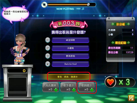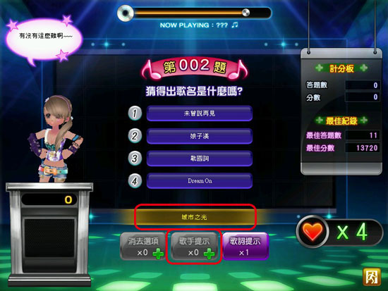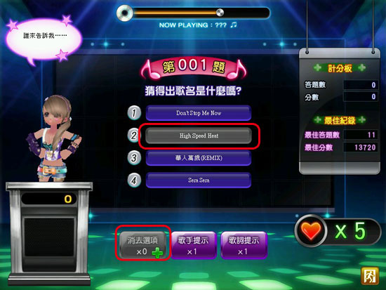 *若「提示選項」使用完畢,也可點選」+」選項進行增加(將會扣除少量G幣)。 *遊玩「金曲智多星」小遊戲,也可以擁有成就唷!