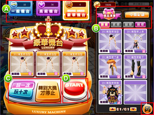 C. 主功能區: 「玩一次」:點下後會選擇自動玩1次,得獎紀錄會紀錄1筆獎勵 「玩十次」:點下後會選擇自動玩10次,得獎紀錄會紀錄10筆獎勵,期間可點下紅色STOP按鈕停止 「轉到大獎才停止」:轉到大獎才會停止,期間可點下紅色STOP按鈕停止