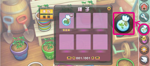 02買種子:點選功能按紐的「種子」→「購買」,即可進行購買種花所需的種子。