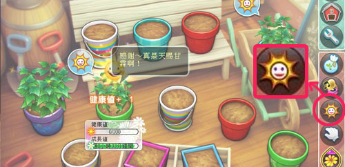 04灑陽光:植物上方出現太陽圖示時,即可對該盆植物進行灑陽光,可增加植物的健康值,健康值越高可收成的花朵數也就越多。(若去好友的花圃幫忙灑陽光,不但可以提升他的花朵健康值,還可以增加自己的愛心值唷~)