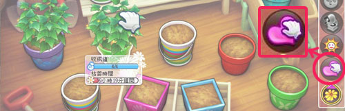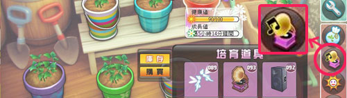 04培育:等不及花兒快快長大~就試試培育道具吧!在花朵進入收成期之前,都可使用培育道具來加快植物的生長速度、提升健康值增加收成,使用不同的培育道具,將會有不同的效果。