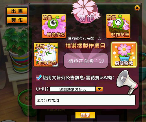 花朵可製作「精靈偽裝道具」、「精靈動作」、「人物動作」、「房間盆栽」道具,可選擇自己使用或贈送他人,還可勾選「使用大聲公公告訊息」來獻花傳情唷~