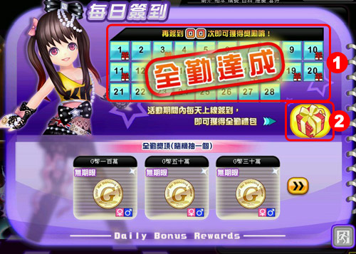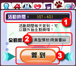 獎勵資訊:此為簽到獎勵之名稱、圖片、性別、期限資訊。