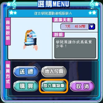 將欲購買的服裝或道具「放入購物車」,若購買G幣服裝請將選擇天數欄位調整為G幣規格。