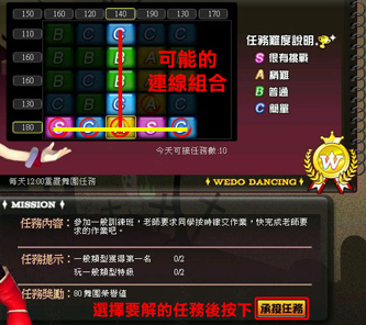 在目前承接的任務上,會蓋上「已承接」的字樣,劃圈則表示舞團內已有人完成該任務。只要團員們同心協力將完成任務連成一線,就可以獲得該條連線的水晶獎勵。