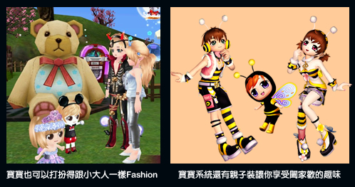 | 寶寶系統還有一項非常特別的地方,就是寶寶的性別會隨著他所穿著的服飾而改變,玩家們可以恣意地將寶寶變男變女變變變,今天是帥氣小王子~明天是可愛小甜心,都由你自己決定! |