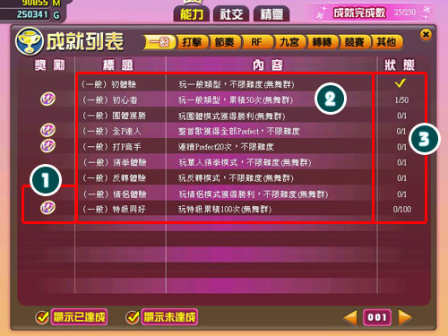 玩家可以在遊戲中任何地方點選下方主功能列的「成就」功能按鈕即可進入查看現階段的成就狀況。也可以在其他玩家的個人資訊中看到他的成就列表唷!