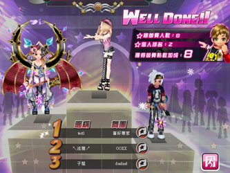 競賽結束進入頒獎畫面,顯示前三名暱稱和舞團。 「個人競賽」總排名前5名的玩家,可獲得額外的競賽點數。 「舞團競賽」得獎者,將顯示團長的人物造型。