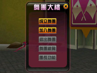 舞團功能:擁有舞團的人可在上方主功能選單看到的舞團功能 1.舞團總覽:可以查看目前遊戲 中所有的舞團。 2.舞團資訊:所屬舞團的資訊& 公告,團長副團長可以修改公 告、團長可在此進行舞團更名。 3.舞團成員:舞團所有團員名單, 成員的階級異動都是透過名單 設定。