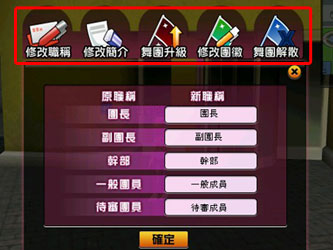 團長功能 1、修改職稱:可修改系統預設的 職稱,上限4個中文字 2、修改簡介:修改舞團簡介 3、舞團升級:舞團人數上限為 20人,可至商城購買「舞團升 級卡」,來升級增加上限,每 使用一次增加上限20人,最多 可擴充至100人 4、修改團徽:成立舞團之後系統 會給予一個預設團徽,可至商 城購買「團徽塗鴉卡」,利用 「團長功能」的「修改團徽」 繪製一個專屬的舞團團徽 5、舞團解散:解散舞團未滿七天 ,所有團員均無法加入或成立 舞團 6、開啟舞團包廂:可使用舞團水 晶開啟舞團包廂