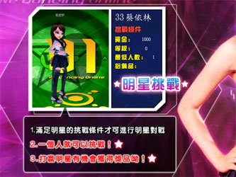 與明星一同共舞,最多可以五人一同挑戰,人越多獎金越高! 選擇方式:於舞蹈廳「自由區」開新房間選擇「一般類型/打擊類型/節奏類型/RF類型/九宮類型/轉轉類型」,勾選「挑戰明星」選項。 玩法: 1.滿足明星的挑戰條件才可進行明星對戰 2.一個人就可以挑戰,以一般類型、打擊類型、節奏類型、RF類型、九宮類型或轉轉類型的方式進行 3.打贏明星有機會獲得獎金或獎品! (提醒:同一個明星多次挑戰獲得的獎金會遞減,遞減到一定程度之後就不會再減少。)