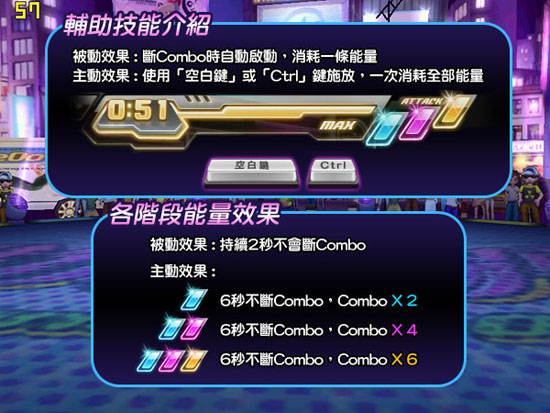 2、能量:於打擊過程中會逐漸獲得能量(除BAD、MISS外),收集能量後可使用"空白鍵"或"CTRL"鍵施放技能,各階段將擁有不同的輔助效果。