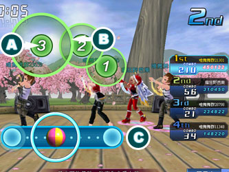 1. 在遊戲畫面中會出現「點點」,在「點點」外會有收縮中的「圈圈」,當「圈圈」縮小到與「點點」契合時,就是最佳打點,此時將滑鼠移動至「點點」處,按下滑鼠左鍵即可。依照準確度,會有Perfect、Great、Cool、Bad、Miss等不同的評價,評價越高分數越高! 2、出現拉霸時即為「連續指令」,此時需按住滑鼠拖曳隨著「點點」移動即可,注意滑鼠不要跑出拉霸喔!