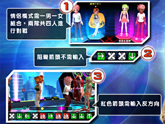 甜蜜蜜情侶模式,同步默契打造超大愛心,兩人感情加速升溫! 選擇方式:開啟房間之後,在「遊玩設定」中,人數選擇「團體」,模式選擇「情侶」。 規則:情侶模式需唯一男一女組合,兩隊共四人進行對戰。 玩法: 1.一般類型:情侶雙方同時按出Perfect愛心就會變大,阻礙箭頭不需輸入,紅色箭頭需輸入反方向。 2.打擊類型:兩人的combo數加起來越高愛心就越大,combo中斷愛心可是會縮水的唷! 3. 節奏類型:兩人的combo數加起來越高愛心就越大,以combo不中斷製造超大愛心為目標吧! 4.RF類型:兩人的combo數加起來越高愛心就越大,combo中斷愛心可是會縮水的唷! 5.九宮類型:兩人的combo數加起來越高愛心就越大,以combo不中斷製造超大愛心為目標吧! 6.轉轉類型:兩人的combo數加起來越高愛心就越大,以combo不中斷製造超大愛心為目標吧!