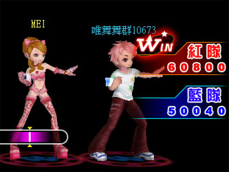 單打獨鬥太無聊,呼朋引伴跳舞去! 選擇方式:開啟房間之後,在「遊玩設定」中,人數選擇「團體」,模式選擇「同步」。 玩法: 1.系統將玩家分為紅藍兩隊,兩隊人數需相等。 2.可以兩兩對戰或三三對戰,勝負由同隊玩家加總判定。 3.等候區中,在自己身上按左鍵即可改變隊伍顏色。