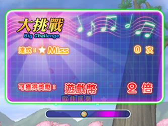 是一種隨機任務,只要達成任務需求就可以得到系統提供的獎勵。在遊戲中只要滿足以下三項條件就可進行「大挑戰」: (1)選擇任一類型玩法。 (2)房間滿4人。 (3)歌曲選擇以下其中一種。 「隨機播放 所有歌曲」 「隨機播放 90 BPM以下」 「隨機播放 90 120 BPM」 「隨機播放 120 150 BPM」 「隨機播放 150 180 BPM」 「隨機播放 180 PM以上」