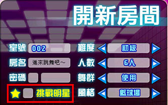 與明星一同共舞,最多可以五人一同進行挑戰,快揪親朋好友來跳舞! 玩法: 1.在開新房間時勾選「挑戰明星」。 2.進入遊戲等待區後,室長點選「選明星」,即可挑選要挑戰的明星,打贏明星就有機會獲得獎金以及專屬獎品。