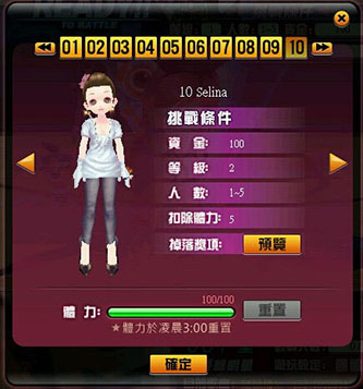 1.需滿足挑戰條件及體力才可以進行挑戰。(多人挑戰時,每位玩家都須滿足喔!) 2.玩家可從明星介面確認當前體力值及預覽掉落獎項(獎項隨機抽出1個)。 3.開始遊戲時將扣除體力,玩家體力上限為100,並於每天凌晨3:00重置。 4.體力可直接點選「重置」按鈕使用M幣補滿,或是使用「挑戰明星體力重置卡(活動送)」補滿。(玩家體力上限為100不可超過) 5.每隻明星都有各自擅長的挑戰類型及難度,掉落的寶物也都不同。 (獲得獎品請於7天內至「收到的禮品」領出,逾期由系統回收!)