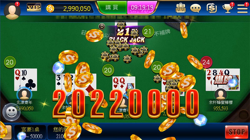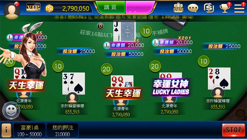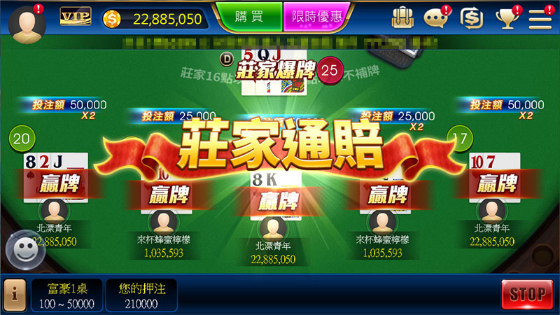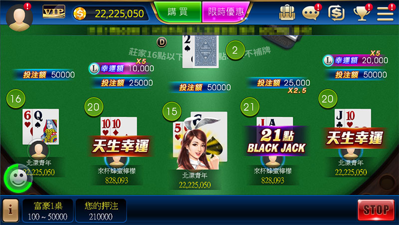 ◆ 多人同遊、一人包牌任你選擇,與莊家比拚點數無極限。