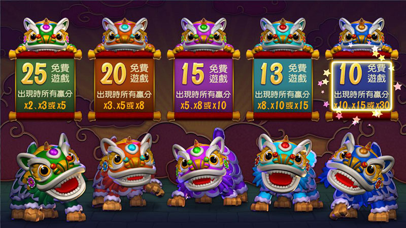 ◆ 五獅迎炮樂翻天,高額倍率奪彩金,五種免費遊戲由你決定!