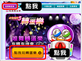 進入「唯舞轉蛋樂」頁面後,請點選「點我玩轉蛋樂」按鈕,或點選上方頁籤的「唯舞轉蛋樂」。