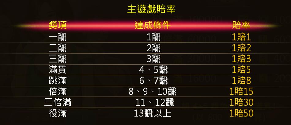 | 役滿 | 等同於13飜,難以湊成的牌型、最大胡牌型態,稱為役滿役;也可飜數累計達成,稱為累積役滿 |