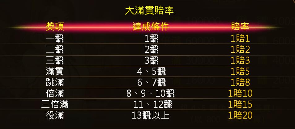 | 滿貫 | 胡牌型之累積飜數達4-5飜 |